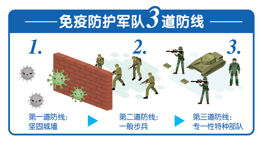 人体免疫系统共有三道防线,第一道防线包含眼睛、皮肤、肠道。它们是坚固的城墙,将敌人阻挡在外,但万一城墙垮了,细菌病毒立马大举入侵。此时,第二道防线好比步兵的巨噬细胞和自然杀手细胞将立即启动,它们数量多且机动性高,随时随地四处巡逻,遇到细菌可快速发动攻击;但攻击力却不强,只能对付较弱的细菌。若遇到攻击力较高较强的病毒,则必须出动第三道防线好比特种部队的T细胞和B细胞:它攻击力强具有独特的专一性,只攻打特定专一病毒,且具有记忆性,同一病毒入侵可快速启动攻击。